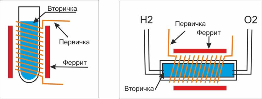 Принцип классического трансформатора. Электрический ток с первичной обмотки трансформируется на вторичную обмотку, а ферритовые кольца обеспечивают полярность вторичной обмотки. Таким образом, половина электролита будет иметь положительную, а другая половина - отрицательную полярность, соблюдая условия для электролиза воды ( получение газа Брауна )