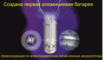 "Мы разработали алюминиевую перезаряжающуюся батарею, которая в самом недалеком будущем сможет вытеснить существующие технологии хранения энергии, такие, как щелочные аккумуляторы, которые неблагоприятны для окружающей среды, железные аккумуляторы, которые отличаются низкой надежностью, и литий-ионные аккумуляторы, которые дороги и пожароопасны" - рассказывает Хонгджи Дэй (Hongjie Dai), профессор химии из Стэнфордского университета, - "Наша новая батарея обладает характеристиками, во много раз превосходящими характеристики батарей любых других типов, кроме этого, она продолжит работать и не загорится, даже если ее ударить чем-то тяжелым или просверлить насквозь".